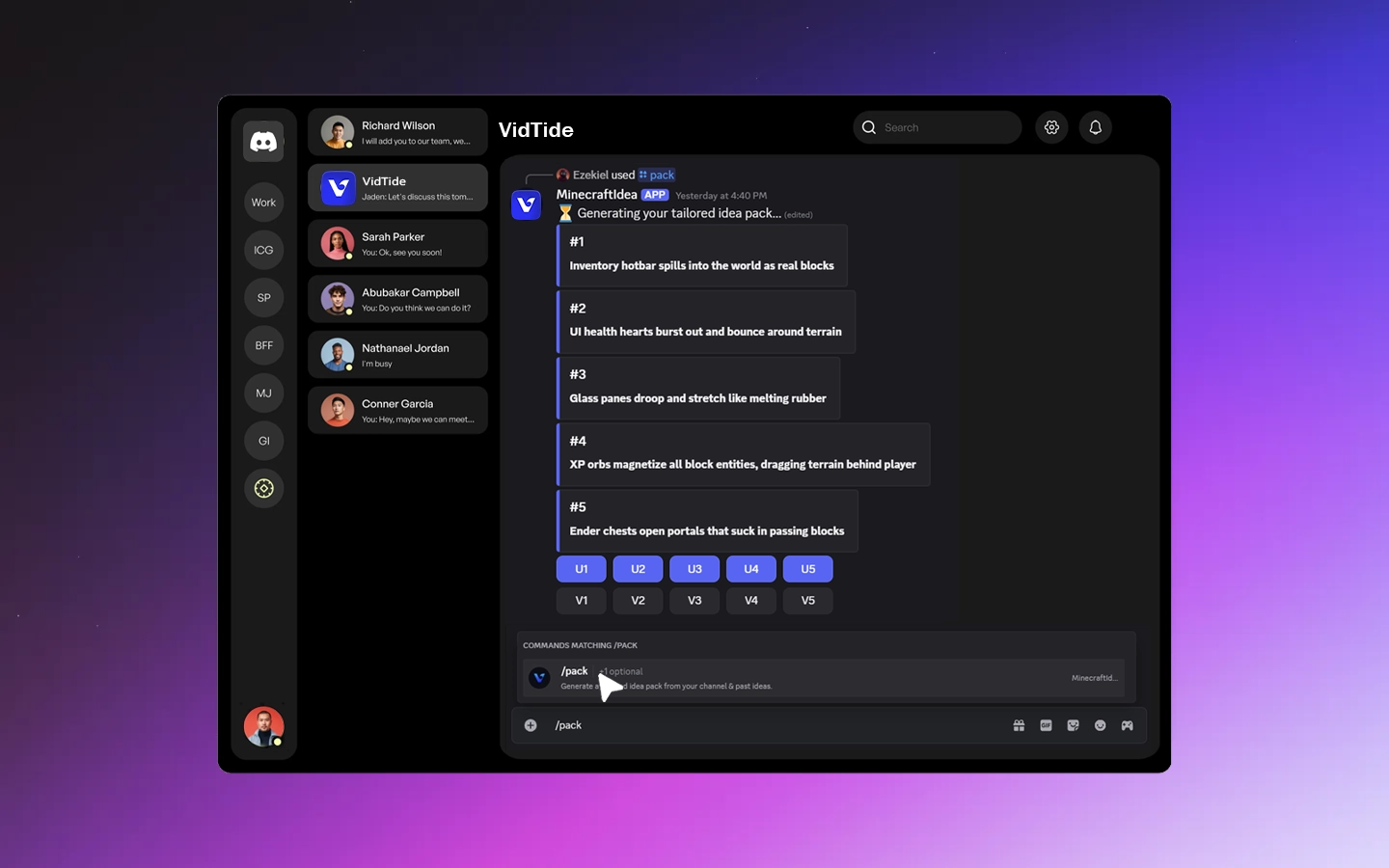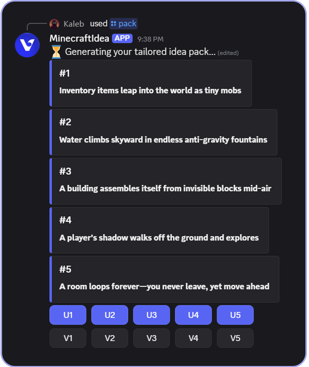 One /pack command. Five original Minecraft concepts tuned to your channel’s style. No more staring at a blank screen