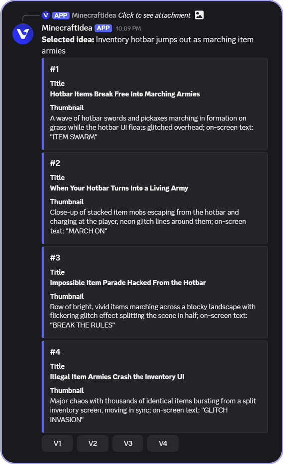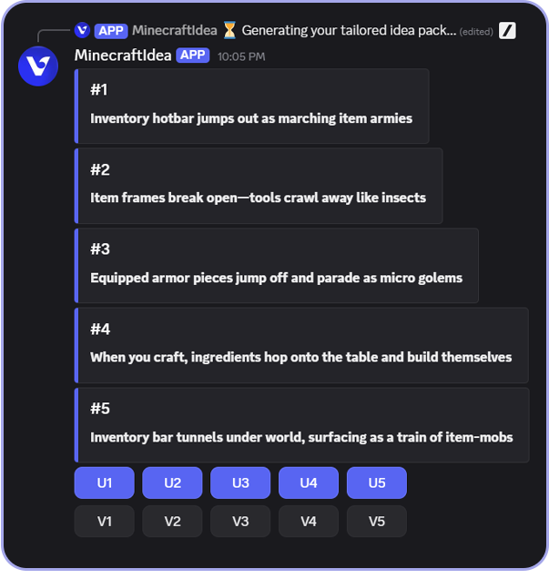 One /pack command. Five original Minecraft concepts tuned to your channel’s style. No more staring at a blank screen